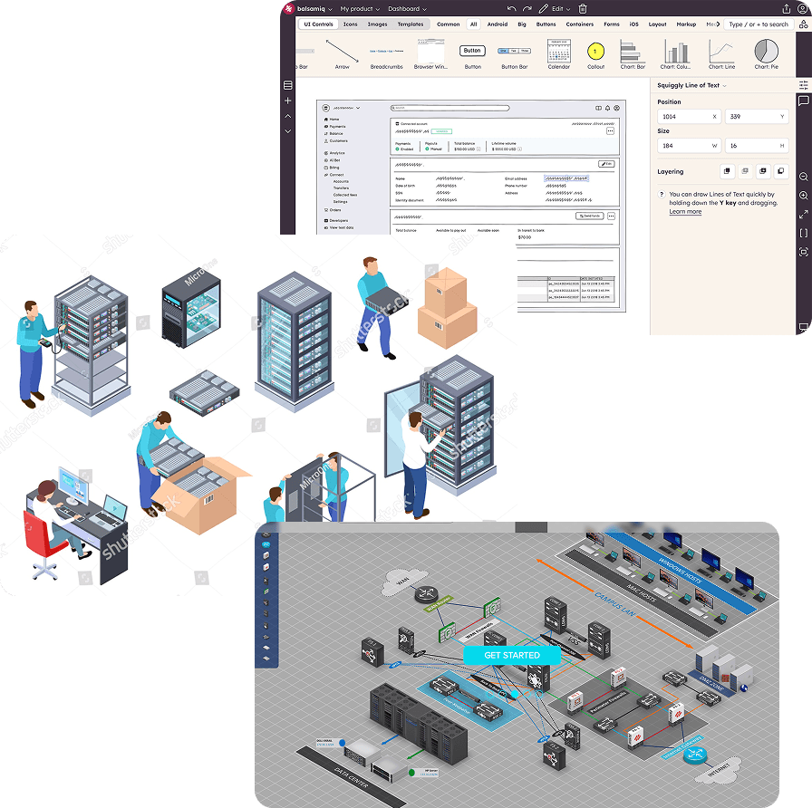 Following the second round of interviews, I refined the illustration system to align with the confirmed needs. I moved to a true isometric perspective to support modularity, introduced rafts for physical and logical clustering, and created front-view overlays for deeper device inspection. These changes made the system clearer, more scalable, and better suited to ISG workflows.