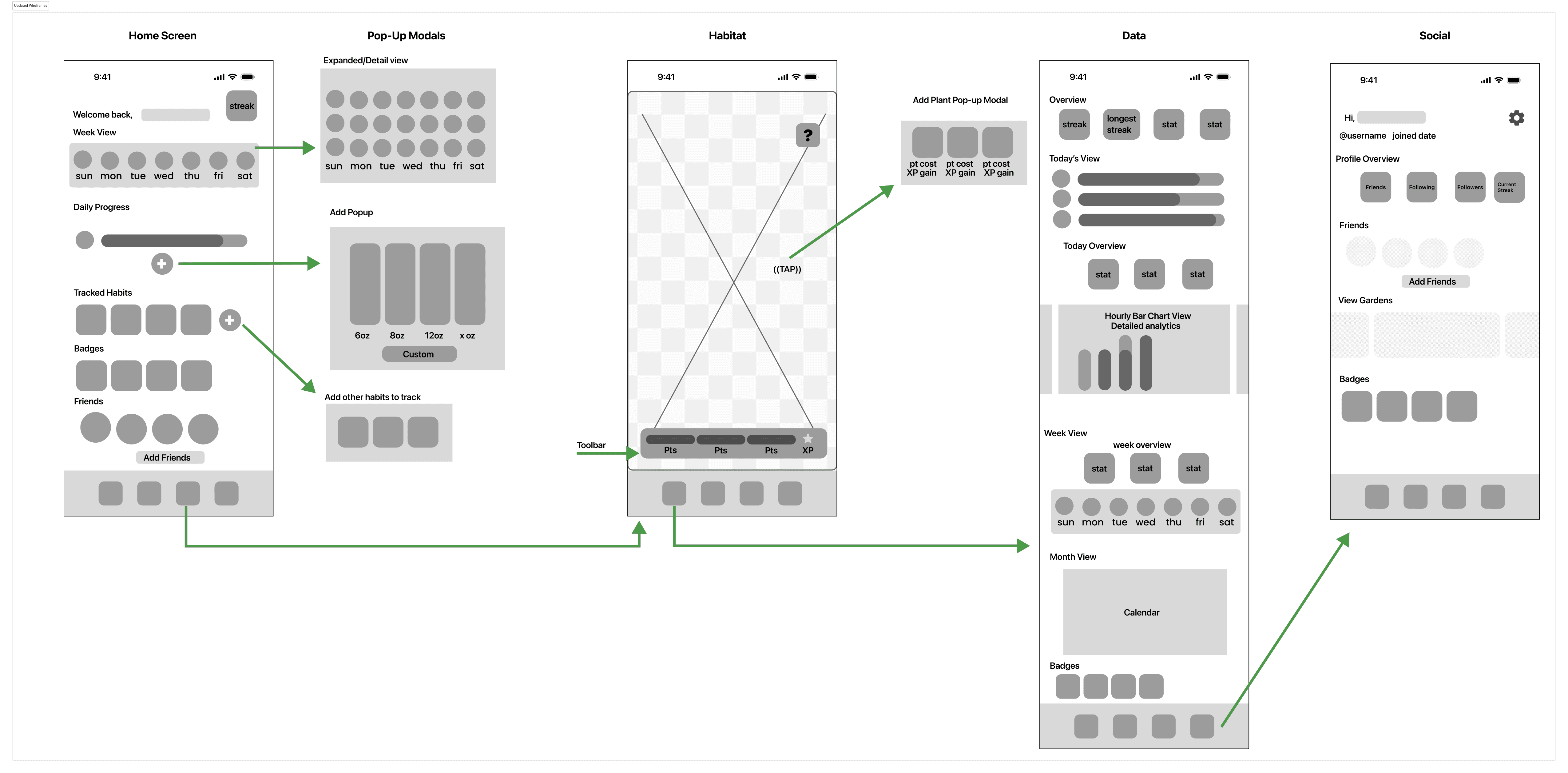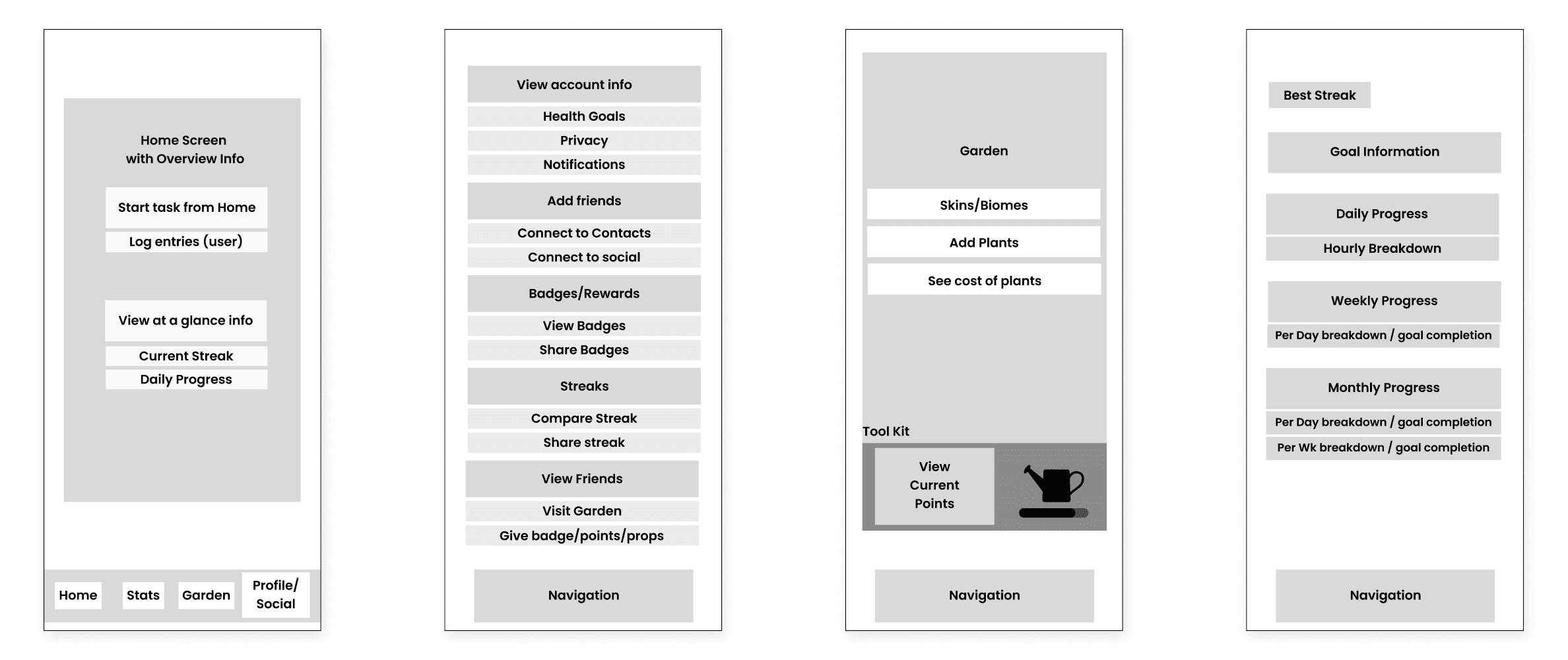 Initially, this led me to start scoping out an app set in a garden or aquarium, encouraging users to drink more water to grow their greenhouse or garden.