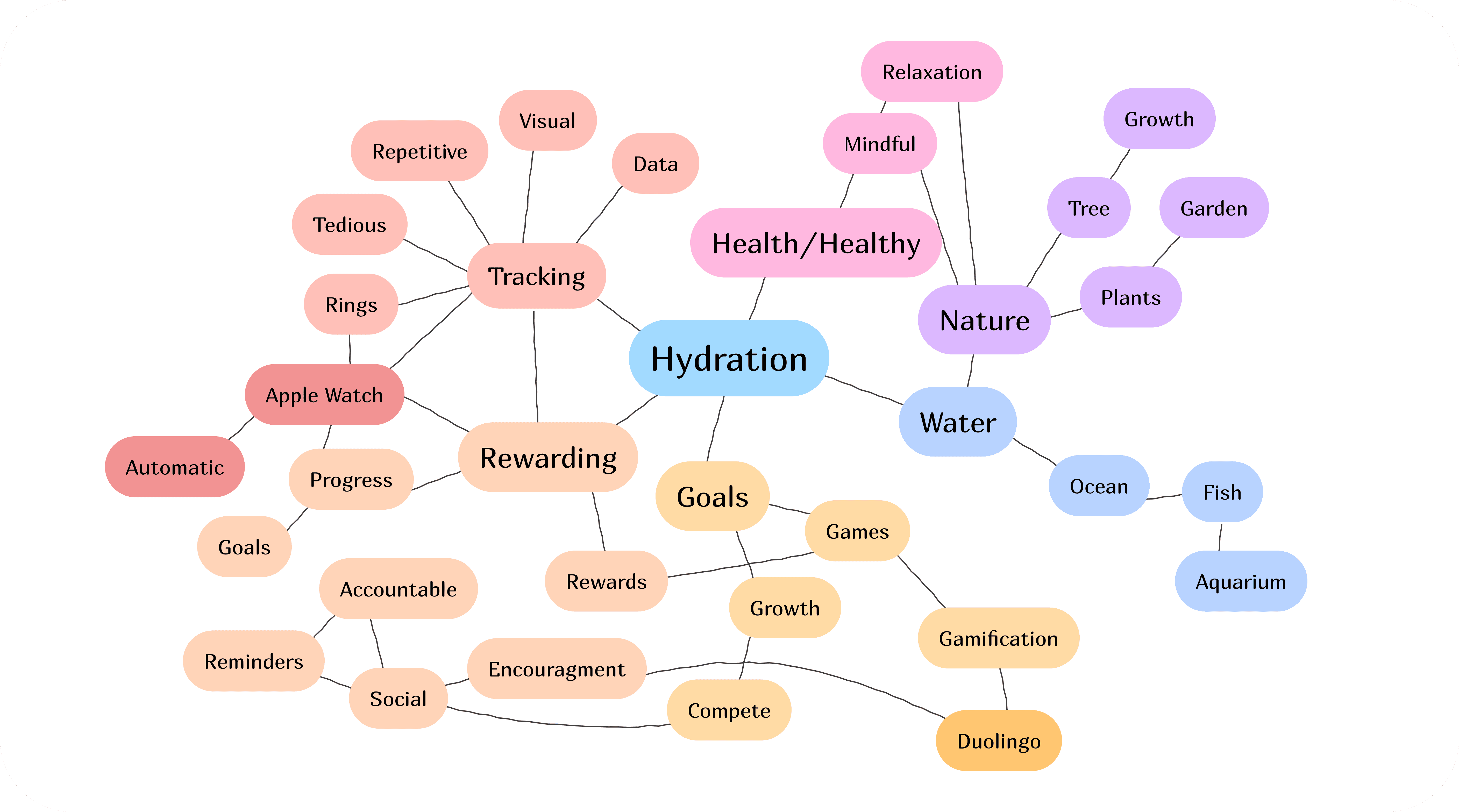 Off the bat I had just thought of doing a hydration related app. Using “hydration” as a jumping off point, I did a complete mind map to see what words popped out of me when I thought of this space.