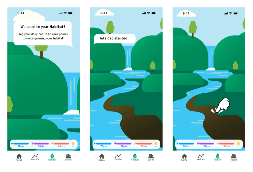 The experience begins with an interactive onboarding moment that connects habits to growth. Each logged habit earns points that help users unlock plants and expand their virtual habitat, turning consistent actions into visible progress.